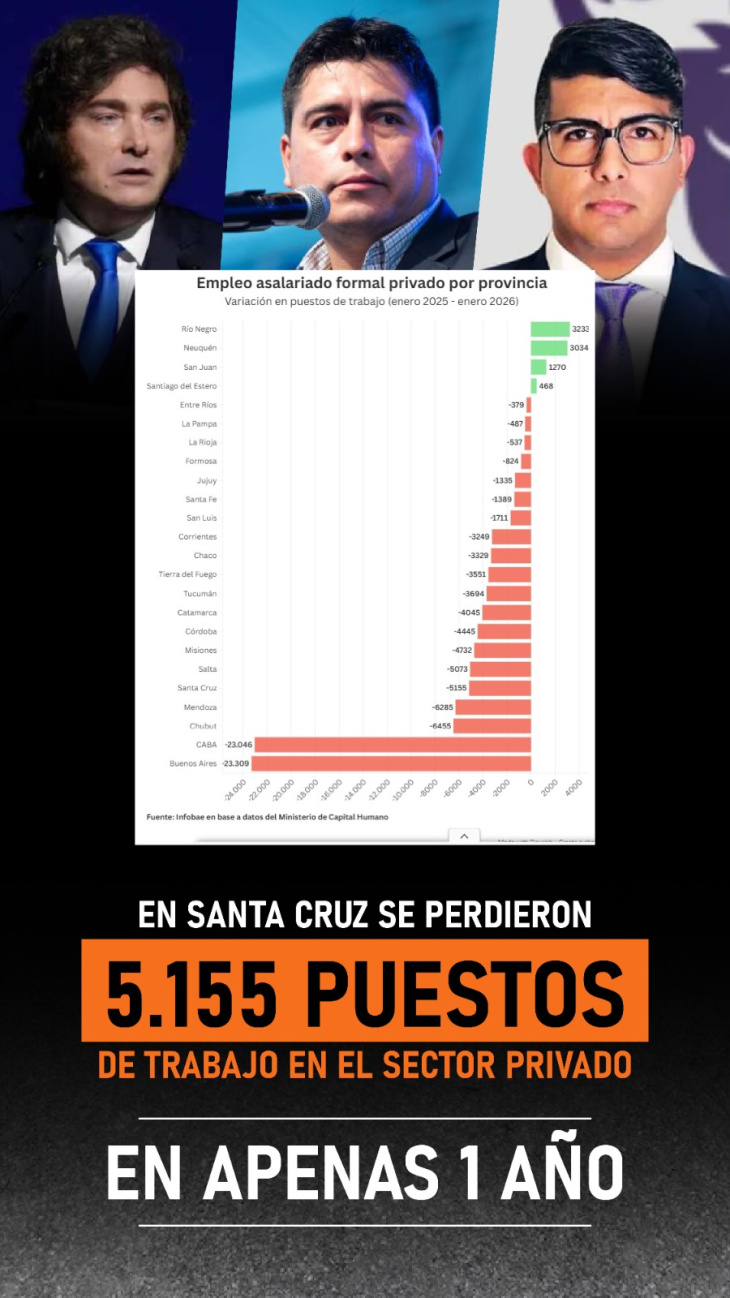 Dentro de ese escenario, Santa Cruz aparece entre las jurisdicciones más afectadas. La provincia perdió 5.155 trabajadores registrados en el período analizado, lo que representa una caída del 8,9% en su nivel de empleo formal privado, ubicándola entre las más golpeadas en términos relativos.